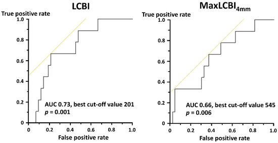 During the median follow-up period of 498.5 [356.5, 1061.5] days, nine (16.7%) patients experienced major cardiovascular events. In the ROC curve analyses, LCBI (area under the curve 0.73, best cut-off value 201, sensitivity 66.7%, specificity 78.6%, p = 0.001) and maxLCBI4mm (area under the curve 0.66, best cut-off value 545, sensitivity 66.7%, specificity 62.8%, p = 0.006) were significantly associated with the occurrence of MACE (Figure 6). The rates of clinical events in the high and low GRACE risk score groups with and without maxLCBI4mm > 400 are shown in Table 3. Despite the lack of statistical significance, patients with the high GRACE score and maxLCBI4mm > 400 were likely to develop MACE (Table 3). Table 4 shows that patients with high GRACE risk score and high maxLCBI4mm with the best cutoff value of 545 had a significantly higher risk of MACE, and the results were similar in combinations of GRACE score and LCBI with the cutoff value (Table 5). All recurrent MI were attributable to events in the nonculprit vessel.