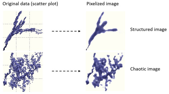 The presence and intensity of interdependency between the components of {x} (so-called generalized correlation) is computed based on a proprietary algorithm which transforms scatter plots to images (Figure 1) [17]. To determine if a given image is structured (i.e., if two variables are correlated) or chaotic, images are treated using entropy based image processing techniques. Images were obtained by subdividing the area of a scatter plot into pixels. The optimal number of pixels is obtained using , where M is the number of data samples. If, for example, M = 100, the area of the scatter plot is subdivided into 10 × 10 mesh. The intensity of each pixel is proportional to the number of data points falling into it. Therefore, any pixel has a density equal to m/M, where m is the number of the data samples falling into it. The main advantage of this approach is that it is independent of the numerical conditioning of the data, the presence of outliers, and its ability to identify the existence of correlation structures where conventional methods fail [11].