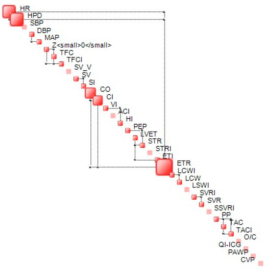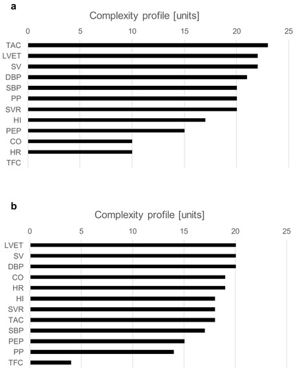 The examples of a complexity profile (CP) are presented in Figure 5a (S2) and Figure 5b (S3). The bars correspond to the contribution of each component to the total system complexity (expressed in percentages). In this example, the bar chart depicts the order of hemodynamic parameters in terms of their contribution to the vasovagal reaction. For both presented cases, SV and LVET are on the top of the complexity drivers. Although both subjects were classified as a mixed type of vasovagal syncope, there were some clear differences between them. In S2, BP indices (SBP, DBP, PP) and TAC had a greater contribution than CO and HR; meanwhile, for S3, it was the opposite.