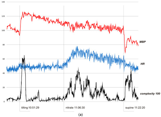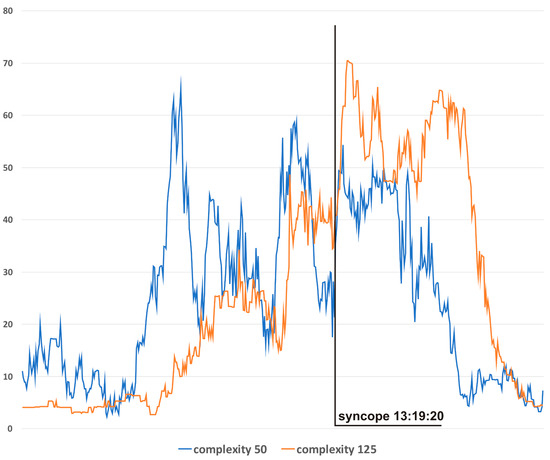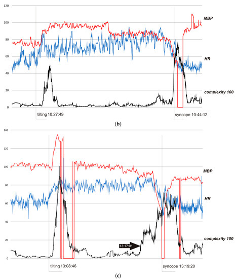 In Figure 3b, the HUTT was positive with syncope type 1 (mixed) according to VASIS classification [20]. In the pre-tilting phase (5 min), complexity was stable (mean value 320 bits). After tilting (10:27:49), complexity suddenly rose to 4900 bits (10:29:24) and then fell to baseline value (stabilization about 10.30). At approximately 10.40, complexity started to rise again, reaching 1290 bits at 10.42.12, then temporarily dropped to a minimum of 400 bits, and eventually rose to 7500 bits during syncope (11:44:45). In the 10.30−10.40 period, complexity was in the range of 100–500 bits (mean 240 bits). In the pre-tilting phase (5 minutes), the mean value of HR was 55.0 bpm and the range of HR during the whole presented examination was 40–95 bpm, with a maximum change from baseline of 73%. In the case of the MBP, the values were 75.4 mmHg, 52–110 mmHg, and 46%, respectively.