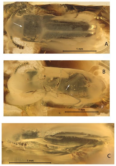 - Jałoszyński, P.; Perkovsky, E.E. Diversity of Scydmaeninae (Coleoptera: Staphylinidae) in Upper Eocene Rovno amber. Zootaxa 2016, 4157, 1–85. [Google Scholar] [CrossRef]