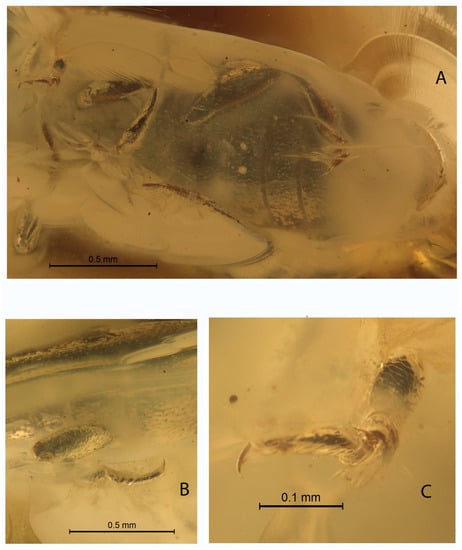 - Olmi, M.; Guglielmino, A.; Vasilenko, D.V.; Perkovsky, E.E. Discovery of the first apterous pincer wasp from amber, with description of a new tribe, genus and species of Apodryininae (Hymenoptera, Dryinidae). Zootaxa 2022, 5162, 54–66. [Google Scholar] [CrossRef]