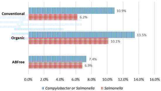 Overall Prevalence and Levels of Contamination by Brand or Category: Campylobacter was found in 4.2% of the chicken breasts and Salmonella was found in 8.6% of the chicken breasts. Of the major brands (Brand 1–Brand 5), Brand 1 had a significantly higher percent positive for Salmonella than all the other major brands. 0.6% of chicken breasts contained both Salmonella and Campylobacter of those tested for both, while 89.18% of chicken breasts were free of both Salmonella and Campylobacter. A total of 10.82% of chicken breasts contained one or both Salmonella and Campylobacter (Salmonella AND/OR Campylobacter), of those tested for both. No significant differences were found for the pathogens when the following categories were compared: (1) Non-organic unverified Antibiotic (AB)-free, Non-organic verified AB-free, Organic verified AB-free, and Conventional; (2) AB-free, Organic, and Conventional; (3) No AB-free claim and AB-free claim. Of the major brands, Brand 1 also had a significantly higher percent positive for Salmonella and/or Campylobacter than all the other major brands (Figure 1). NARMS retail chicken meat testing in 2015 found 6.1% of samples positive for Salmonella and 24% positive for Campylobacter, both showing a declining trend when compared to previous years [31]. The USDA’s baseline study on raw chicken parts obtained from processing plants in 2012 found positive rates of 26.3% for Salmonella and 21.4% for Campylobacter [32]. However, these studies had differing sample designs, collection points/methodologies, collection seasons, product types, and/or testing methodologies; and the results are not directly comparable. In addition, USDA FSIS published a study showing possible antimicrobial carryover in the rinsate from samples collected at the processing plant, causing false negative results [33].