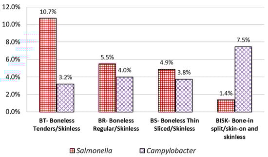 During 2021, most infections reported to FoodNet were caused by Campylobacter or Salmonella, with the five most common Salmonella serotypes for more than 10 years remaining predominant [3]. Contamination with these pathogens can occur at multiple steps along the food chain, including on-farm production, processing, distribution, retail marketing, and during handling or preparation [4,5]. Food poisoning symptoms most often caused by these foodborne pathogens include stomach cramps, fever, vomiting and diarrhea; however, symptoms that are more serious may include bloody diarrhea and temporary paralysis [6,7]. Many animal species serve as reservoirs for these pathogens, especially chickens. According to CDC outbreak data from 2009–2015, chicken was responsible for the most illnesses, sickening 3114 people, or about 12% of the total illnesses, in the outbreaks for which a specific food was determined to be the cause [8]. Foodborne illness source attribution estimates for 2019 indicate that 64.7% of non-dairy Campylobacter illnesses were attributed to chicken [9]. Microbiological testing of raw meat purchased at the retail level provides information on possible consumer exposure to pathogens on raw meat prior to the food handling and preparation stages, as well as potential cross-contamination risk in commercial facilities and domestic settings.