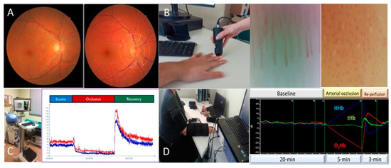 Indices of microvascular assessment. (A) Non-mydriatic digital fundus photography and imaging of retinal vessels. (B) Nailfold video capillaroscopy (NVC), examination and a representative image obtained during NVC. (C) Recording of skin microvascular reactivity during arterial occlusion and re-perfusion using Laser Speckle Contrast Analysis. (D) Near infrared spectroscopy—representative data of skeletal muscle oxygenation during arterial occlusion and after re-perfusion. HHb: Deoxygenated haemoglobin, tHb: Total haemoglobin, O2Hb: Oxygenated haemoglobin.