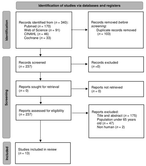 A complete search was carried out in different databases, resulting in a total of 340 articles. Subsequently, a filtering for duplicate articles was performed, leaving a total of 237 unique articles. These articles were then examined considering the title and abstract and the eligibility criteria; only 13 articles were included [23,24,25,26,27,28,29,30,31,32,33,34,35], while the other 224 articles were excluded. The flow diagram of the study selection based on the PRISMA statement [36] is presented in Figure 1.