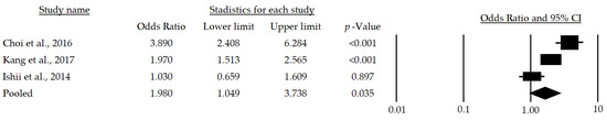 Forest plot of the association of metabolic syndrome and sarcopenia in men [24,28,29,30]. The black box represents the point estimate for the respective study, while the size of the box represents the population size, and the horizontal line is the 95% CI. The diamond-shaped figure represents the estimated point of the mean odds ratio.