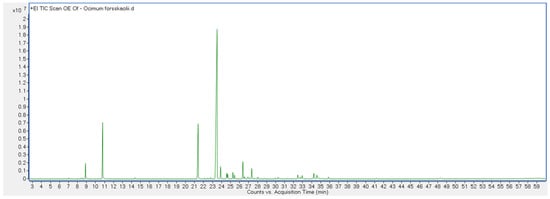 To the best of our knowledge, the chemical composition of the O. forskolei essential oil (OFEO) from samples growing wildly in Saudi Arabia was here reported for the first time, and analysis results are reported in Table 2. Overall, 33 compounds were detected, covering 100% of the whole composition. Phenylpropanoids, representing 68.7%, were undoubtedly the major detected chemical class, with methyl eugenol (55.6%) and eugenol (12.1%) as the most abundant constituents. Sesquiterpenes were also found in relevant percentages, even though their hydrocarbon form prevailed (14.2%). Among this class, the most representative components were germacrene D and β-caryophyllene, both detected in amounts below 5%. Among sesquiterpenes, also the sulfide derivative mint sulfide was identified, and it was detected in the genus Ocimum for the first time.
