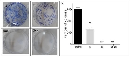 Clonogenicity of HCT116 cells following 72 h treatment in a six-well plate with (i) vehicle control, (ii) OFEO (6 μg/mL), (iii) OFEO (12 μg/mL), and (iv) OFEO (24 μg/mL). (v): Bar chart showing the four treatments (x-axis) against the number of HCT116 colonies (y-axis). Experiments were repeated three times. Statistical differences compared with untreated control cells were assessed by one-way ANOVA with the Tukey’s post-hoc multiple comparison test (p < 0.010 (**), p < 0.001 (***) were taken as significant).