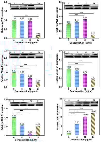 Following the identification of HCT116 cell line as the most sensitive to the OFEO, the possible underlying cell proliferation/survival, cell cycle, and apoptosis molecular mechanisms of cell death were investigated. Immunoblotting can be used to identify the up- and down-regulated proteins based on different concentrations of tested essential oil. Figure 3 represents the relative gene expression of studied genes related to GAPDH as reference protein. Caspase 3 was up-regulated, while the AKT, pAKT, PCNA, Bcl2, and cyclinD1 were down-regulated.