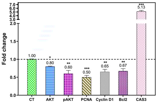 qRT-PCR results showing fold change in the gene expression of (decrease): AKT, phosphorylated AKT, PCNA, cyclin D1, and Bcl2. Caspase 3 increased in HCT116 cells treated with OFEO (12 ug/mL, 24 h). Gene expression was related to GAPDH as a housekeeping gene, and was normalized to the untreated cells (control, CT = 1-fold change as shown by the dashed line). p < 0.100 (*), p < 0.010 (**), and p < 0.001 (***) were taken as significant.