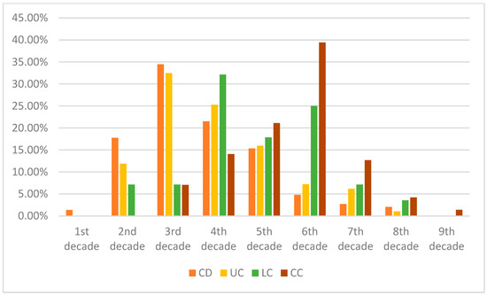 Comparison of average age at diagnosis of our patient cohorts—in the percentage of patients. It is worth noting that MC in the first two–three decades of life is extremely rare, though there is a possibility of under-report. It is worth noting that, in earlier life decades, Crohn’s disease had the highest diagnosis rate, whereas the incidence of UC is typically at a later age. Both subtypes of MC had a higher age of diagnosis.