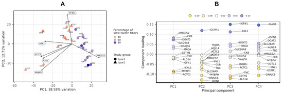 Principal component analysis of transcriptomic profiles by the PCAtools R package, version 2.2.0. (A) PC1-PC2 plot showing the study groups and the percentage of slow-twitch muscle fibers. (B) Component loadings for the first four PCs. PC, principal component.