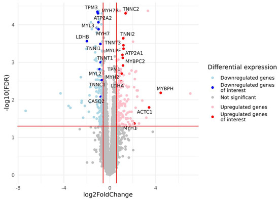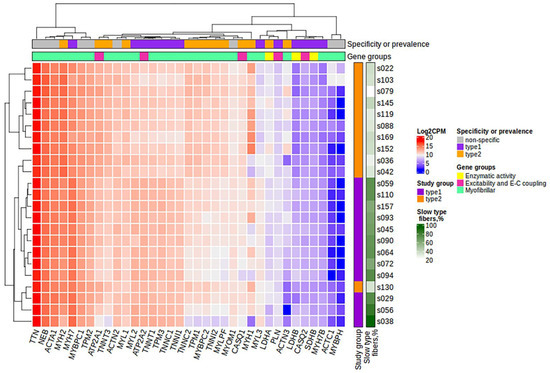 After filtering and quality control (see the Materials and Methods section for details), the total number of protein-coding genes expressed was 9086. PCA based on the expression of protein-coding genes from the RNA-seq data showed clear separation of clusters including samples with a predominance of type I and type II fibers on the PC1-PC2 plot (Figure 1). With the criteria of |log2FC| > 0.585 (changes more than 1.5-fold) and FDR < 0.05, we identified 352 differentially expressed genes, among which 180 were upregulated and 172 were downregulated in the predominance of fast muscle fibers (all genes with FDR < 0.05 are listed in Table S1). Based on studies of transcriptomic and proteomic differences between type I and type II muscle fibers [7,9], we selected 35 protein-coding genes belonging to three groups based on their expression being (1) specific to a particular fiber type, (2) having differences between slow and fast fibers, and being (3) specific for skeletal muscles but without the expected differences between fiber types (Table A2, Appendix A). Genes were classified into three main groups according to their biological origin and role: (1) myofibrillar structural proteins, (2) proteins related to excitability and excitation–contraction (E–C) coupling and (3) proteins related to general enzymatic activity. Mitochondrial protein genes were not included in this list; however, their expression was expectedly elevated (from 1.4- to 1.8-fold, with average 1.6-fold for 12 genes with FDR < 0.05) in slow fibers because of the higher number of mitochondria and increased oxidative activity. Based on this gene list, we built a heatmap of their expression in the study groups (Figure 2). Based on the expression of these 35 genes, the samples were grouped according to the predominance of a particular fiber type, except for a few individual samples. Almost all genes from groups specific to a particular fiber type or prevalent in slow or fast fibers were differentially expressed among the study groups (Figure 3). Genes characteristically expressed in the slow fibers (MYH7, MYH7B, MYL2, MYL3, TNNC1, TNNI1, TNNT1, TPM3, ATP2A2, CASQ2 and LDHB) were upregulated in the slow-fiber-dominated group. Genes characteristically expressed in the fast fibers (MYH1, MYH2, MYLPF, MYBPC2, TNNC2, TNNI2, TNNT3, TPM1, ATP2A1 and LDHA) were upregulated in the fast-fiber-dominated group. Interestingly, two genes for which no differences in expression between muscle fiber types were expected (ACTC1 and MYBPH) were strongly upregulated in the group with a predominance of fast fibers. However, the expression of these genes was very low, and the differences between the groups could be a result of random fluctuations among the samples. Overall, the expression of characteristic proteins associated with muscle fiber type allowed us to clearly separate the two groups with fast and slow fiber predominance based on the transcriptomic data.