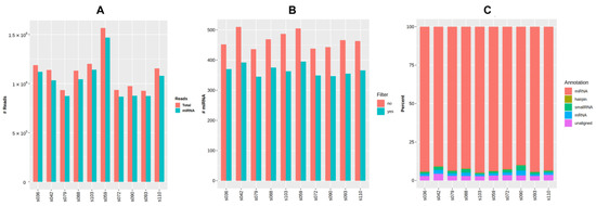 Raw small RNA sequencing data for ten samples were deposited to NCBI’s Sequencing Read Archive (SRA) with BioProject accession number PRJNA887354. The general data of miRNA sequencing analysis are presented in Figure 4 and are additionally provided in Table A3, Appendix A. The average number of reads per sample considering the settings and filters in QuickMIRSeq tool was 1.09 M (0.91 to 1.53 M), with the mean ratio of miRNA reads being 95% (92.8 to 96.4%). The total number of miRNAs detected within the sample varied from 345 to 395.