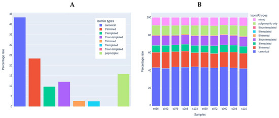 The analysis of miRNA isoforms (isomiRs). (A) Presence of different isomiR types in the set of samples used for the miRNA analysis (n = 10). (B) Percentage of each isomiR type in each study sample.