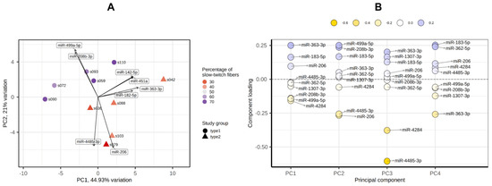 Principal component analysis of miRNA profiles by the PCAtools R package, version 2.2.0. (A) PC1-PC2 plot showing the study groups and the percentage of slow-twitch muscle fibers. (B) Component loadings for the first four PCs. PC, principal component.
