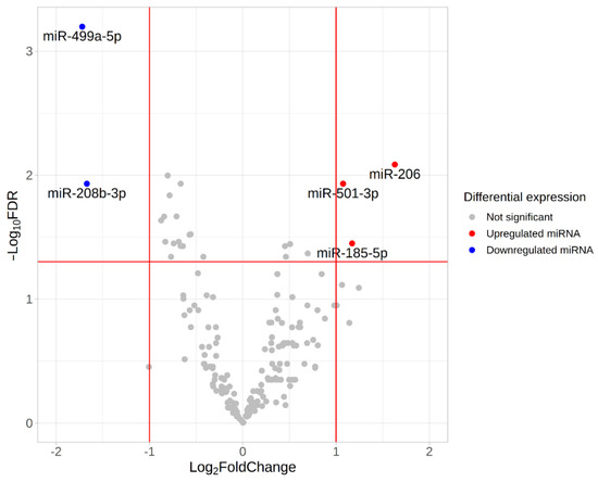 We found five differentially expressed (DE) miRNAs (Table 3 and Figure 8). Upregulation of miR-206, miR-501-3p and miR-185-5p, and downregulation of miR-499a-5p and miR-208-5p was found in the group with fast-twitch fiber prevalence compared to the group with slow-twitch fiber prevalence (Figure 9 and Figure 10).