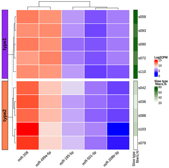 This study was the first to describe the differences in miRNA profiles in human skeletal muscle with distinct fiber type composition using high-throughput small RNA sequencing. For this study, a unique set of athlete m. vastus lateralis tissue biopsy samples were collected in which the proportion of fast- and slow-twitch fibers had marginal values, which deviated from the average expected ratio for that muscle type [76,77].