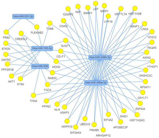 We also calculated the correlation between the expression of miRNAs and their potential target genes. Strong positive and negative correlations with the absolute value of correlation coefficient > 0.8 are shown in Table 5. We found 11 strong negative correlations, 2 of which belonged to differentially expressed miRNAs, miR-208b-3p and miR-499a-5p, and indicated their possible regulation of the expression of genes CDKN1A and FOXO4, respectively. Using the MIENTURNET web tool [75], we built the interaction network between miRNAs and their experimentally validated mRNA targets with at least two shared miRNA–target interactions and the adjusted p-value (FDR) ≤ 0.1 (Figure 11). The network shows that the two miRtronic miRNAs specific to slow fibers, miR-208b-3p and miR-499a-5p, share the highest number of common targets and probably have similar regulatory functions, as their seed region sequences are identical in the first six nucleotides.