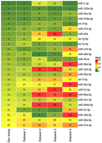 Comparison of miRNA composition in human vastus lateralis skeletal muscle in our study and five different studies based on miRNA sequencing. The relative abundance of miRNAs is represented as ranks assigned on the basis of counts per million (CPM) values. The characteristics of the datasets and number of samples taken for the comparison are provided in Table 6. Dataset 1: PRJNA276561 [79], n = 5; dataset 2: PRJNA403822 [80], n = 10; dataset 3: PRJNA306562 (FUSION Tissue Biopsy Study dataset) [81], n = 10; dataset 4 [82]: PRJNA524317, n = 3.