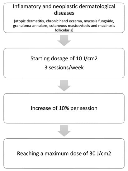 Patients with the other diseases (atopic dermatitis, chronic hand eczema, mycosis fungoides, granuloma annulare, cutaneous mastocytosis, and mucinosis follicularis) were prescribed a phototherapy scheme at slightly higher doses based on the literature available to date and the possibilities offered by our equipment (starting dosage of 10 J/cm2, 3 sessions/week, with an increase of 10% per session, up to a treatment course of 25 sessions, achieving a maximum dose of 30 J/cm2) (Figure 2).