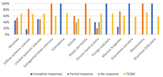 The overall objective clinical response rate was 91.30% (42/46), obtaining complete response in 17 (36.96%) patients, partial response in 25 (54.34%), and no response in 4 (8.70%). High complete response rates were recorded in morphea, scleredema, or chronic hand eczema. In terms of the level of satisfaction objectively measured by TSQM-9 version 1.4, the average score was above 50 points in all of the entities treated, with particularly high scores obtained in mastocytosis, systemic sclerosis, morphea, scleredema, chronic hand eczema, or prurigo nodularis (over 65 points) (Figure 3).