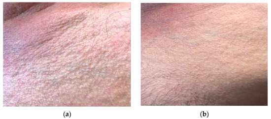 Patient with scleredema and orange skin appearance: (a) Patient’s condition prior to treatment with UVA1 phototherapy; (b) complete response of the patient after treatment with 25 sessions of UVA1 phototherapy at low doses.