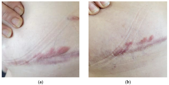 Patient with submammary keloids on the right chest: (a) Patient’s condition prior to treatment with UVA1 phototherapy; (b) reduction in the erythema of the lesion was observed after 25 sessions. In addition, there was a remarkable reduction in pain and discomfort reported by the patient.