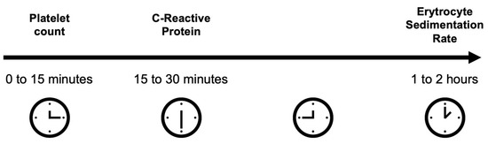 - Miller, A.; Green, M.; Robinson, D. Simple rule for calculating normal erythrocyte sedimentation rate. Br. Med. J. (Clin. Res. Ed.) 1983, 286, 266. [Google Scholar] [CrossRef]