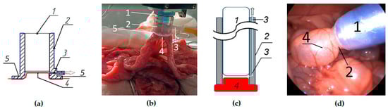 The device was tested in two series of experiments—on minipigs (group I, n = 10) and on rabbits (group II, n = 10). The animals were kept in accordance with the rules adopted by the European Convention for the Protection of Vertebrate Animals used for Experimental and Other Scientific Purposes (Strasbourg, 1986). The experimental study was approved by the Ethics Committee of the Privolzhsky Research Medical University (Protocol #12 from 8 August 2022). Minipigs and rabbits were chosen for experiments due to the proximity to the anatomical and physiological parameters of the human digestive tract and the possibility of open and laparoscopic surgery with control of hemodynamic parameters (monitor uMEC12 Vet Mindray).