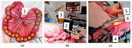Experimental OCTA study. (a)—group I, open abdomen surgery, ischemic segment of the intestine taken out through the laparotomy wound (1—mesenteric arteries are ligated, yellow marks—areas of the OCTA study of the ischemic intestine, green marks—areas of the OCTA study of the intact intestine); (b)—group I, intraoperative OCTA using vacuum tissue compression (2—OCTA probe with the connected vacuum unit, 3—monitor with displayed OCT/OCTA images); (c)—group II, OCTA during laparoscopic surgery (4—instruments and a camera inserted into the abdominal cavity, 5—OCTA probe, 6—suction tube).