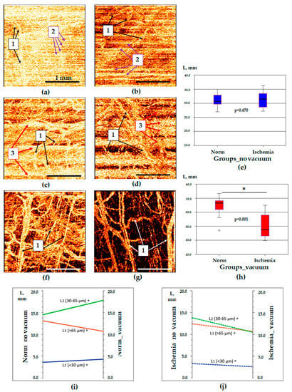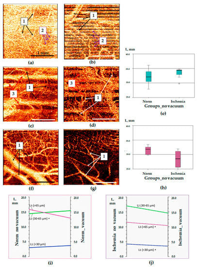 OCTA images of the small intestine obtained in open surgery and their quantification. (a,c,f)—normal intestine, (b,d,g)—ischemic intestine; (a–d)—manual pressure was used for tissue stabilization; f—tissue stabilization was achieved by developed vacuum unit; (e,h)—median values of the total blood vessels length in OCTA images of normal and ischemic intestine using manual fixation of the probe (h) and developed vacuum unit (h); (i)—changes in the lengths of various-diameter vessels in OCTA images of normal intestine with mechanical fixation (norm_no_vacuum) and using vacuum fixation (norm_vacuum); (j)—changes in the lengths of various-diameter vessels in OCTA images of ischemic intestine with mechanical fixation (ischemia_no vacuum) and using vacuum fixation (ischemia_vacuum). 1—blood vessels, 2—artifacts caused by mechanical probe vibrations, 3—artifacts caused by respiratory movements and peristalsis. *—Statistically significant differences in the length of blood vessels of a certain diameter in OCTA images due to the use of a vacuum stabilizer (i,j).