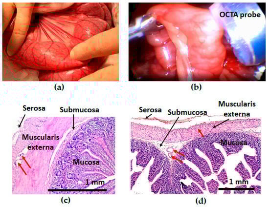 - Kiseleva, E.; Ryabkov, M.; Baleev, M.; Sizov, M.; Moiseev, A.; Gelikonov, G.; Peretyagin, P.; Vorobiev, A.; Gladkova, N. Intestinal optical coherence tomography (angiography) imaging: A comparison between animal models and humans. Adv. BioMed Clin. Diagn. Surg. Guid. Syst. 2022, 11949, 46–54. [Google Scholar] [CrossRef]