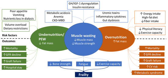 In clinical practice, muscle wasting may be observed in both undernutrition and overnutrition conditions (Figure 1). In the following, we will present the patterns of malnutrition which may concur with muscle wasting in CKD pediatric patients.