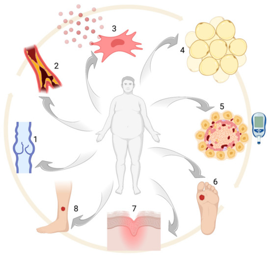 At present, obesity affects 1.7 billion people worldwide [1]. Notably, obesity often leads to a wide range of possible comorbidities, including cardiovascular disorders and diabetes (type 2 diabetes mellitus, T2DM, in particular) [2]. Most of these obesity-related diseases carry an intrinsic risk of developing chronic ulcers and/or causing significant impairment in physiological wound healing. For example, venous insufficiency is the commonest cause of chronic ulcers and is often associated to—and worsened by—obesity. Venous stasis may also determine delayed wound healing because of altered capillary flow due to impaired hydrostatic pressure [3,4,5]. Another frequent cause of chronic ulcers is peripheral artery disease (PAD), which is notably caused by atherosclerosis and therefore is, in turn, associated with obesity and/or T2DM. PAD determines a reduction in oxygen flow and nutrient supply, which are essential for tissue repair, and sometimes leads to the development of arterial ulcers through tissue ischemia. Neuropathy is another relatively common cause of cutaneous ulcers and represent a key driver for the development of chronic wounds in diabetic patients [6].