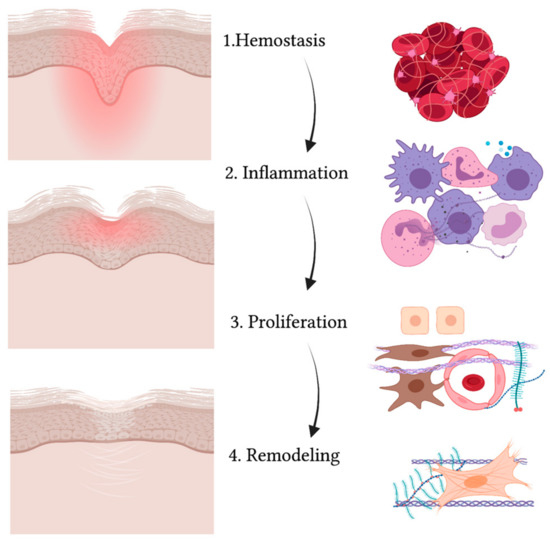 A wound is defined as a disruption in the normal continuity of the skin. When the skin is injured, a series of events takes place in order to close and heal the area where the barrier is compromised [55]. Wound healing is an evolutionary-conserved process comprised of four sequential yet overlapping phases: hemostasis, inflammation, proliferation and remodeling (see Figure 2) [56]. These phases are strictly regulated through specific molecules that are expressed at different levels at each time interval [57].