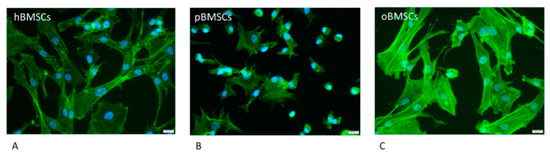 Morphology of the different BMSCs. The BMSCs of the different species were stained with Phalloidin-iFluor 488 conjugate to stain the actin filaments within the cytoplasm (green) and DAPI to stain the nucleus (blue) The scale is 20 µm and the cells were in passage 3. (A) hBMSCs; (B) pBMSCs; (C) oBMSCs.