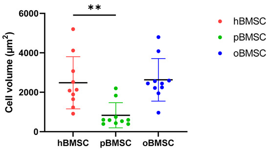 Cell volumes of BMSCs. The different cell volumes are shown in µm2. The volumes of hBMSCs and oBMSCs are approximately comparable. The pBMSCs are only one-third of the size of the hBMSCs. N = 10, ** p < 0.002.