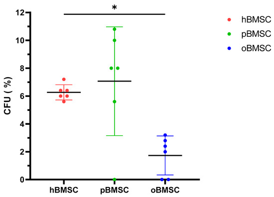 Evaluation of the CFU assay in Figure 3 shows that pBMSCs with a mean of 7.07% had a comparable renewal potential to hBMSCs with 6.27% (p = 0.84). With 1.73%, oBMSC could only form a third of the colonies compared to hBMSC (p = 0.01).