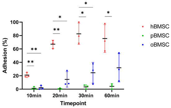 Adhesion assay. The percentage of the adhesion was analyzed and compared between hBMSCs, oBMSCs and pBMSCs after 10, 20, 30 and 60 min. At all time points, the adhesion of hBMSCs were significantly higher compared to oBMSCs and pBMSCs. n = 3, * p < 0.033, ** p < 0.002.