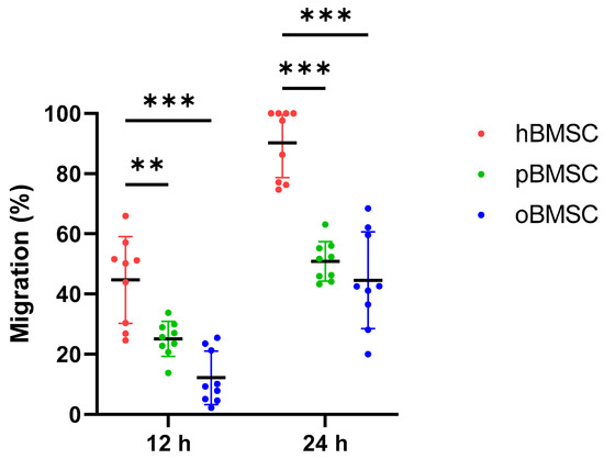 After 24 h, the migration capacity of both oBMSCs with 44.8% (SD 16%) and pBMSCs with 50.9% (SD 6.6%) increased compared to the time point 12 h (Figure 6). However, it was still significantly lower compared to hBMSC with 90.2% (SD 11.5%). For oBMSCs and pBMSCs, a significant reduction in the migration capacity with p ≤ 0.001 was measurable compared to hBMSCs.