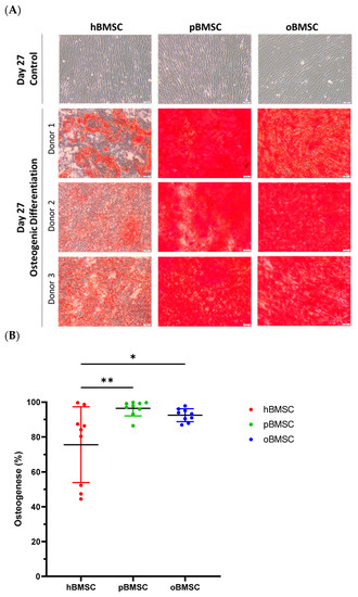 Representative pictures of alizarin red staining showing mineral depositions of calcium are shown in Figure 7A on day 27 of differentiation of hBMSCs, oBMSCs and pBMSCs. All donors of each species were able to induce osteogenic differentiation (Figure 7). On day 27, 75.6% (SD 21.7%) of the area of hBMSCs, 92.5% (SD 3.7%) of the area of oBMSCs and 97.9% (SD 4.3%) of the area of pBMSCs were positively stained with alizarin red. These results indicated a better osteogenic differentiation capacity of oBMSCs (p = 0.03) and pBMSCs (p = 0.006) compared to hBMSCs. As expected, the non-induced samples showed no signs of osteogenic cell differentiation.