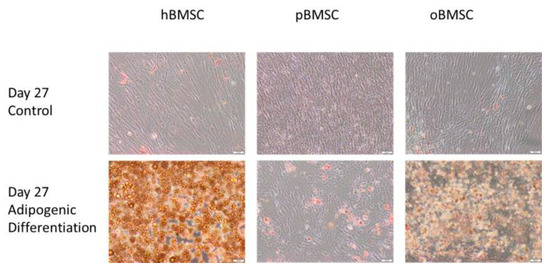 Adipogenic differentiation. Representative images of adipogenic differentiation after staining with Oil Red O of hBMSC, pBMSCs and oBMSCs. Controls are shown above and pictures of induced adipogenic differentiation are shown below. Little to no adipogenesis was observed in the control. Scale bar = 50 µm.