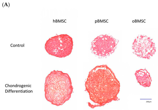 Representative pictures of chondrogenic differentiation after 27 days are shown in Figure 9A. Quantitative evaluation revealed a chondrogenesis level with 16.54% in hBMSCs (SD = 3.95%) and 23.16% in pBMSCs (SD = 13.4%) on day 27. Only 0.18% were stained with Safranin O in the oBMSCs (SD = 0.2%). These results indicate no significant chondrogenic differentiation between hBMSCs compared to pBMSCs and oBMSCs. Only hBMSCs and pBMSCs were able to perform a chondrogenic differentiation in pellet culture in all three donors. In sheep, no differences were observed between the pellets incubated in control medium or chondrogenic medium. As expected, the non-induced samples showed no signs of chondrogenic cell differentiation.