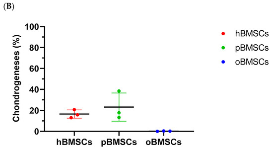After completion of adipogenic differentiation and staining, hBMSCs had more stained fat vacuoles compared with oBMSCs and pBMSCs in the current study. Especially for pBMSCs, this might be due to the fact that fat vacuoles are secreted during differentiation, and consequently, vacuoles are no longer fixed intracellularly. Thus, wash-off of the stained vacuoles could have happened during the staining and washing process. This observation is in agreement with a study performed with pBMSCs [18]. The reason for this could additionally be excessive lipid formation leading to many unfixed vacuoles. In this context, Noort et al. showed that pMSCs formed fat much faster than hMSCs [18]. For oBMSCs, there are only publications that provide a successful adipogenic differentiation but do not report about the morphology of the fat vacuoles. Confirmation of the success of adipogenesis in sheep was additionally provided by the study of McCarty et al. Again, positive results were obtained after four weeks in induced medium intended for human stem cells. However, the number of stained fat vacuoles was also low, which is consistent with our study [32]. Regarding the chondrogenic differentiation, our study showed that pBMSCs are comparable to hBMSCs. This is in line with the findings of Noort et al., supporting the findings that pMSCs are able to differentiate in the chondrogenic direction. However, chondrogenic differentiation in oBMSCs was not successful in our study. In turn, Haddouti et al. showed that oMSCs in pellet culture can perform chondrogenesis after 21 days. They cultured them on agarose gel and stained with Alcian Blue, and the medium was comparable to the one used in our study [6]. In addition, Zscharnack et al. showed that chondrogenic differentiation of oMSCs is enhanced under low oxygen conditions (5% O2) [33]. Furthermore, mechanical stimulation showed the improvement of chondrogenesis potential [34].