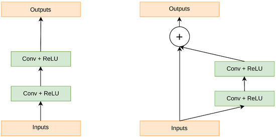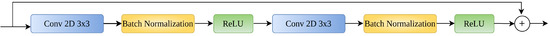 35]. A residual block is a building block used in deep residual neural networks and it mathematically defined as follows: Given an input tensor x, a residual block applies one or more layers of nonlinear transformations (such as convolutional layers, batch normalization, and ReLU activation) to produce an output tensor y. The final output of the residual block is then computed as the elementwise sum of the input tensor x and the output tensor y, added via an elementwise addition operation. This is represented mathematically in Equation (