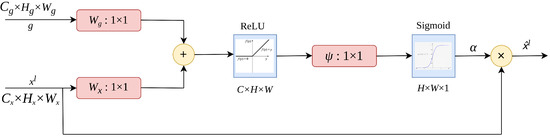 36] is used in the deep learning process, the processing of human visual information is emulated by introducing the attention module. The attention to irrelevant areas will be limited by raising the information weight of the region of interest in the feature extraction process of the input image. Naive skip connections simply concatenate the encoder and decoder features, wasting computing resources and producing duplicate information. Because the encoder feature contains extensive location information, it is preferable to concentrate on relevant regions that are useful for determining the position of the item and determining the target structure of the object.