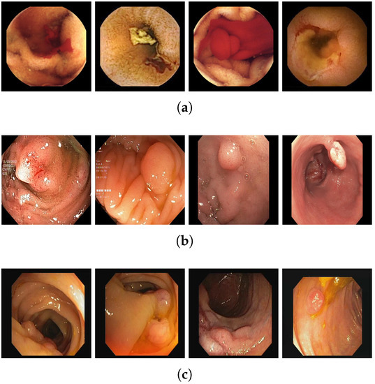 41]. It contains 1131 bleeding lesions and 2164 normal images. All frames were manually annotated by expert physicians. The images have 320 × 320 or 512 × 512 resolutions. The dataset was created with images from various cameras, such as MiroCam, PillCam SB1, SB2, and SB3, and with various red lesions, such as angioectasias, angiodysplasias, hemorrhage, and others.