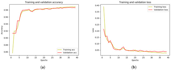 During the segmentation process, all the experiments were implemented in Python 3.6 by using the Keras framework with Tensorflow as a backend. They were conducted on an NVIDIA GeForce GTX 1050 (4 GB GPU memory) Core i7. We worked with a Ubuntu 16.04 LTS operating system with Cuda 8.0.61 version installed. For this study, we randomly selected 60% of each dataset for the training, 20% for the validation, and the resting 20% for the test set. We have manually conducted different experiments with multiple sets of hyperparameters on the same dataset and with the same model in order to get the optimal set of hyperparameters. Those sets were chosen based on the empirical evaluation. In the training phase of all the cases, our models performed well with the batch size of 40, Adam as an optimizer, and 50 for the epochs. and were set to 0.9 and 0.99, respectively. In addition, to prevent overfitting, we employed an early stopping mechanism. Early stopping is a type of regularization used when training a model by using an iterative approach like gradient descent. Because all neural networks train utilizing gradient descent, early stopping is a strategy that can be applied to any task. With each iteration, this strategy improves the model fit to the training data. This increases the model performance on data from the test set to a point. However, enhancing the model’s fit to the training data after that point leads to higher generalization error. Early stopping criteria specify how many iterations may be performed before the model begins to overfit.